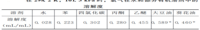 直到上学期,看到魏明贵老师的一段线上讲座内容,使笔者感觉可能是找到了答案。因此,在网上找到数据,表格如下,可知,在通常状况下,氧气在大豆油(铁钉生锈条件探究实验中,一般会使用大豆油)中的溶解度约等于水中的 20 倍左右。表格中其他的有机溶剂中,氧气的溶解度也都比水中的大 10倍以上