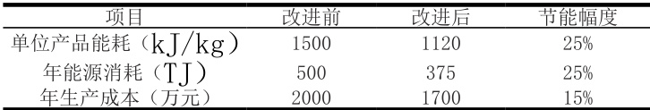 节能改造后单位产品的能耗由 1500kJ/kg 降低到 1120kJ/kg , 节能率达25% ,每年节约的能源由 500TJ 降至 375TJ, 降低了 20% ,这样就可以大大降低能源的消耗,对生产有重要的意义。同时节约了能源,又增加了节能改造设备的使用率,在节能改造的同时减少了生产成本,以原煤为例每吨煤的价格按150 元来计算,仅煤价就降低了 300 万元。节能减排还可以使企业年节约 500万元以上的生产费用,因为节能项目所用原材料的价格是随市场价格波动而浮动的,由于这几年一直走高,所以节能改造可以增加企业的经济效益,在降低生产能源成本的同时还会多出一些节余的资金来改善生产工艺,从而可以达到保护环境、减少温室气体的效果。