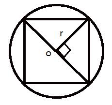 正方形的对角线互相垂直又恰是圆的直径,假设半径为 r ,两个三角形面积为: 2r×r÷2×2=64 即 r2=32 ,圆的面积为: r2=32×3.14= 100.48( ⋅cm2 )