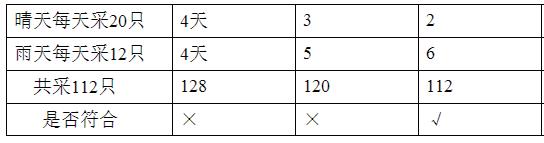 例5. 松鼠妈妈采松子,晴天每天采20 个,雨天每天采12 个,一共采了 112 个,平均每天采14 个。这几天晴天有几天?