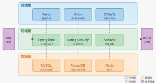 社区健康监测手环数据管理平台采用现代化的分层架构与前后端分离模式,这种设计理念促进了系统各组件间的解耦与独立迭代。前端层以 Vue.js为核心构建响应式用户界面,结合 Axios 处理 API 请求,ECharts 完成健康数据的可视化呈现;后端层则依托 Spring Boot 框架提供标准化 RESTful 服务接口,同时 Spring Security 组件负责系统安全防护,Actuator 模块实现运行状态监控;数据层采用多数据库协同策略,MySQL 存储用户信息等结构化数据,MongoDB 管理设备原始日志,Redis 缓存系统热点数据以提升访问效率 [2]。整体架构通过明确的责任分离实现了系统的高内聚低耦合。社区健康监测手环数据管理平台系统架构见图1。
