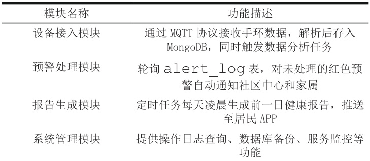 表1 社区健康监测手环数据管理平台核心功能模块