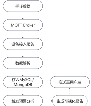 社区健康监测手环数据管理平台的数据流程设计贯穿系统各功能模块,构建了从数据采集到最终展示的完整闭环,确保健康监测数据高效流转与处理。在正常运行状态下流程图见图2。而针对设备异常情况,平台实施多级容错机制,当检测到手环设备离线后系统立即记录离线事件,若 30 分钟内仍未恢复连接,则自动生成设备故障工单并通过短信或应用内消息通知相关运维人员,确保系统服务连续性。