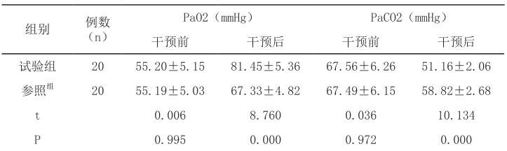 干预前,两组相关血气指标无显著区别( ⋅P>0 .05)。干预后,各组 PaO 升高,试验组数值比参照组大,两组PaCO2 均降低,试验组结果低于参照组 (P<0 .05)。见表1。
