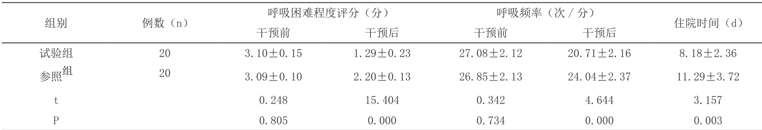 两组干预前呼吸情况数值无显著差异( (P>0. .05)。干预后,两组呼吸困难程度评分、呼吸频率均比参照组低,试验组数值小于参照组,试验组住院时间比参照组短 (P<0.05) 。见表2。