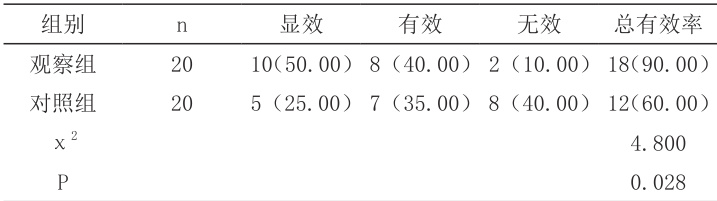 (3)临床疗效。患者经由治疗后,呼吸困难症状显著缓解,血氧分压提高 30%,血二氧化碳分压降低超过30%,维持正常呼吸频率,为显效。经由治疗后,呼吸困难程度减轻,血气指标改善超过 15%,低于 30%,呼吸频率好转,为有效。与以上条件不符合,甚至病情恶化,为无效。显效率+ 有效率= 总有效率。