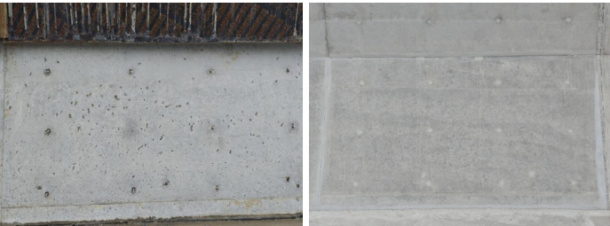 (1)问题描述:拆模后,部分混凝土之间夹杂着模板布,将模板布外侧混凝土凿除后,混凝土表面存在一些坑坑洼洼的地方。