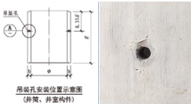 吊装孔是 $\$ 50$ 短钢管嵌入井墙内所形成,吊车的吊钩难以伸入,在井体倾斜时,容易造成侧翻和吊钩脱落,实际施工时,采用钢筋贯穿构件进行吊装,由于是利用钢筋的剪力,造成钢筋弯折,吊装孔口上方容易破损,容易造成吊钩滑落,产生安全风险。在安装好之后尚需填充处理。