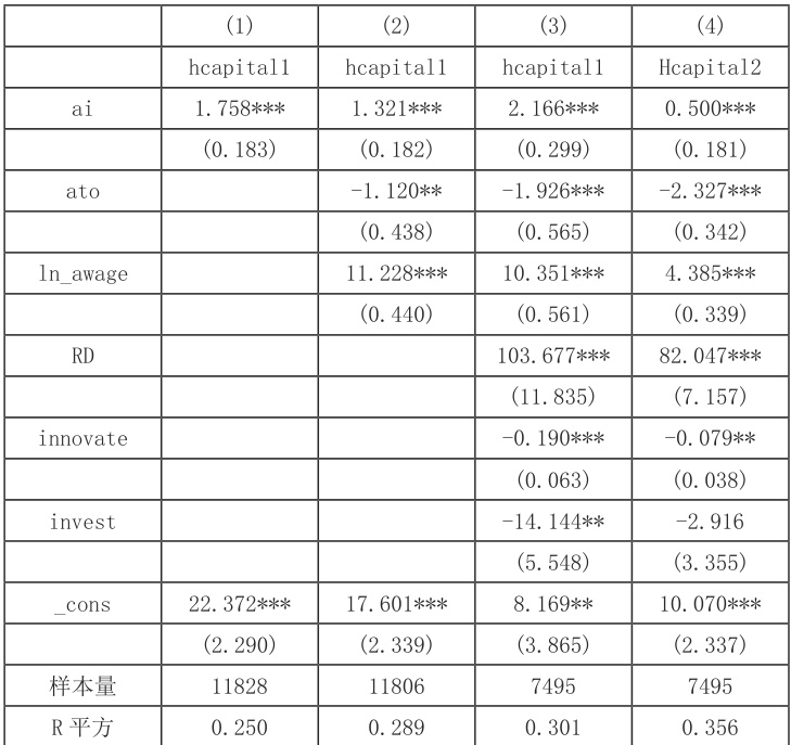 3. 控制变量:为缓解遗漏变量偏误,本文参考已有文献选取运营能力、工资水平、研发水平、资本深化程度、产品创新共 5 个控制变量。(1)运营能力(ato),用企业的总资产周转率来衡量,旨在反映企业对于资产的使用效率。(2)工资水平(awage),用平均工资来衡量。(3)研发水平(RD),用企业研发投入与应付职工薪酬的比值来刻画。面对人工智能带来的生产率提高,企业会更加偏向研发投入等资本密集型投入,影响企业的人力资本结构。(4)资本深化程度(invest),用企业的固定资产投入来表示。(5)产品创新(innovate),用无形资产账面价值与企业总资产的比值表示。