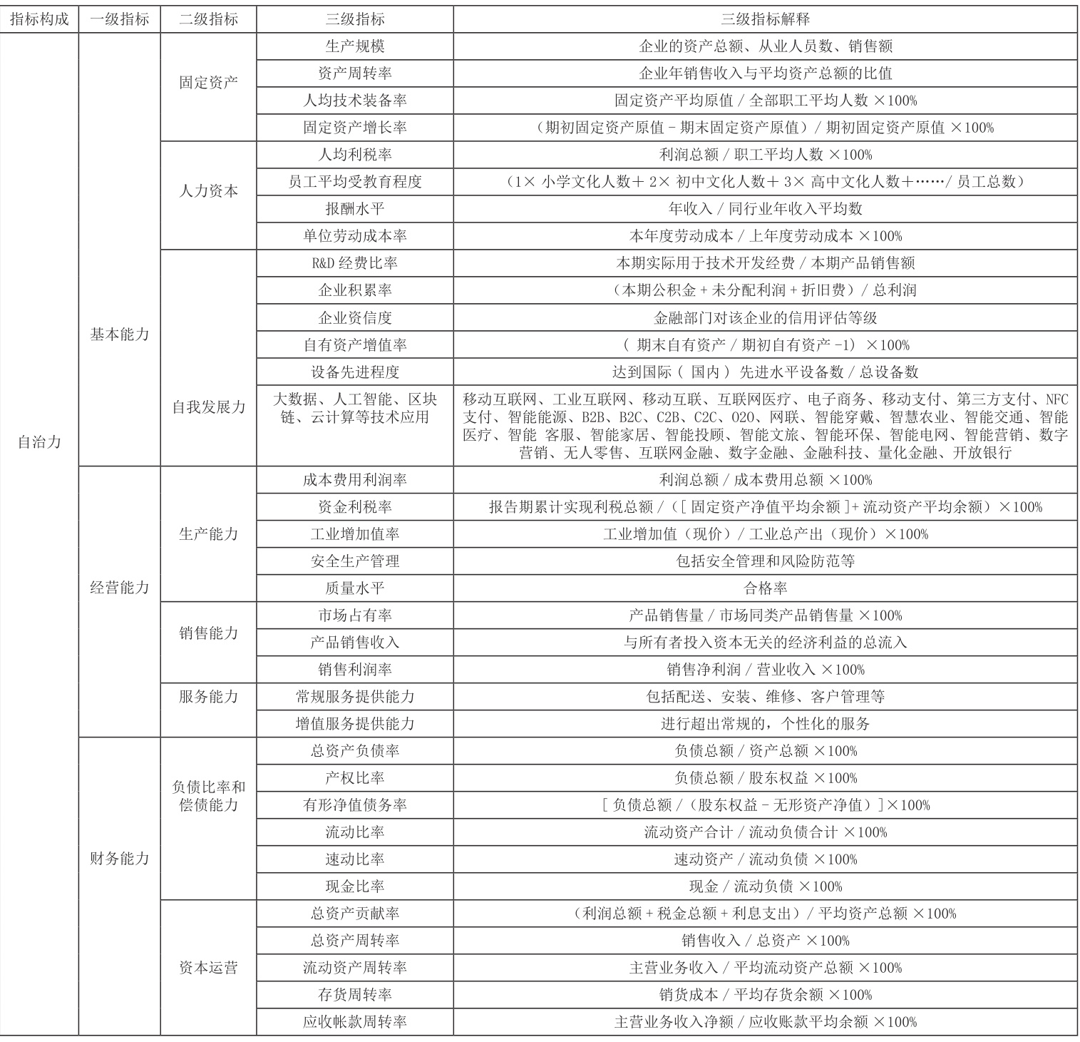 在自治力指标体系中包含基本能力、经营能力与财务能力三个子体系。