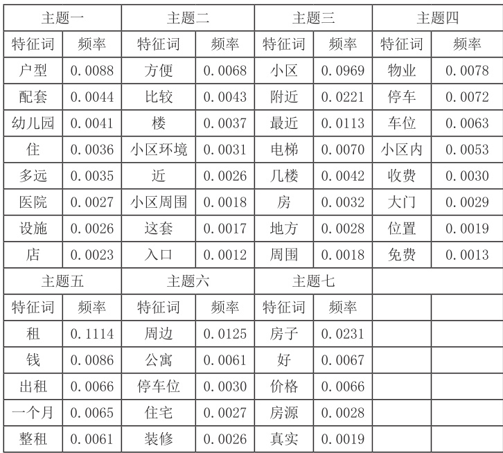 主题 1 概括为小区生活,因为描述的内容主要包括户型及周边配套设施。主题 2 概括为居住便利性,描述的内容主要涉及房屋比较及小区环境。主题 3概括为小区空间属性,内容主要包括小区位置及房屋条件。主题 4 概括为小区管理,主要内容包括公共收费、小区进出与交通。主题 5 概括为租赁成本,内容主要涵盖房源种类、租房相关费用、居住条件和租赁时间。主题 6 概括为房产配套,主要内容包括:房产类型、生活配套、区位交通及车位。主题 7 概括为房源品质,描述内容主要包括:房源属性相关内容。从以上高频词分析和LDA 主题分析可得消费者在租房时的关注点主要集中在上述七个方面,这也是消费者在问答评论中经常谈论的话题。