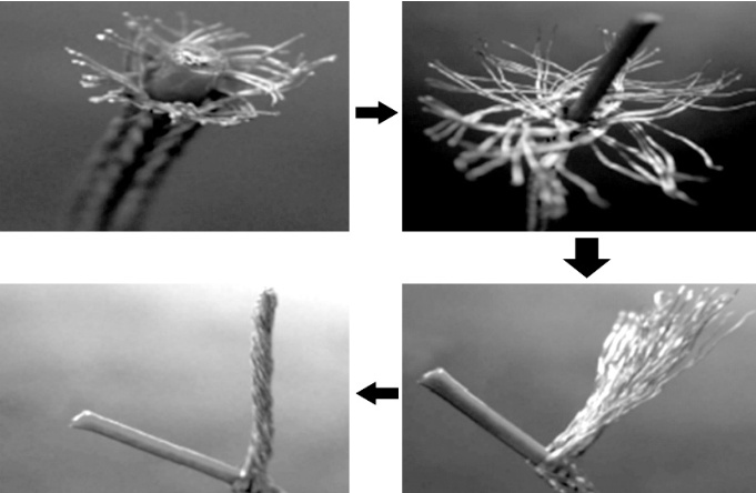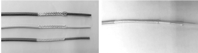 针对屏蔽层较密的导线,采用分散剥离法进行操作,具体步骤如图 3。如下第一步:用镊子将屏蔽金属丝端头沿屏蔽编织纹理向导线绝缘层外侧四周拨散呈喇叭状; 第二步:用镊子将散开的屏蔽丝顺着屏蔽编织纹理继续往下打散,直至到要求的位置;第三步:从打散的屏蔽金属丝根部任选一点,用镊子沿着编织纹理将屏蔽金属丝拨开,并将所有金属丝汇集到一起后,捋直;第四步:将散开的屏蔽丝以 45∘ 左右的方向进行手工绞合,绞合时不宜过紧,