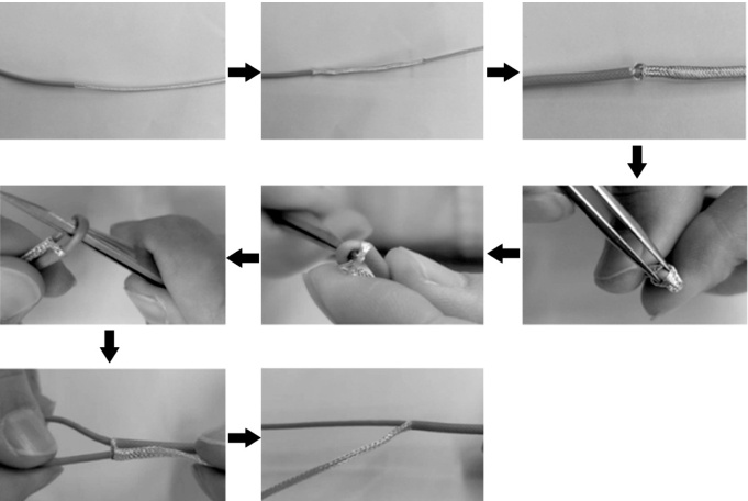 采用抽出法进行屏蔽导线屏蔽层处理,具体步骤如图 2。第一步:剥去导线外绝缘层;第二步:将屏蔽层向后推,在屏蔽层根部形成松弛区域;第三步:在导线外绝缘层上方 1-2mm 处的屏蔽层处,从两股交叉金属编织丝线的交界处取一点,用镊子从此点处将屏蔽层轻轻向四周进行推拨形成小孔;第四步,用镊子夹住导线的内绝缘层两侧,将导线弯折,用镊子把屏蔽层轻轻下压以扩大小孔;第五步;将镊子背部伸至导线内绝缘层下,用手将屏蔽层向下推;第六步,用镊子背部将导线向上挑出;第七步,挑出至一定程度后,可以用手将导线全部拉出;第八步,自检挑出的导线,导线绝缘层和屏蔽层不得有损伤。