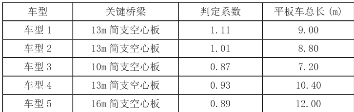 对每种桥梁类型都进行评估验算虽然能准确评估出哪些桥梁满足通行要求、哪些桥梁不满足通行要求,但是验算工作量大,需要搜集较全面的桥梁设计图纸和对每一种桥梁类型进行建模,会花费大量的时间,不利于快速审批。判定系数最大的桥梁即为该车型的关键桥梁,各车型的关键桥梁见表1。