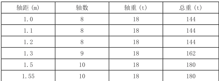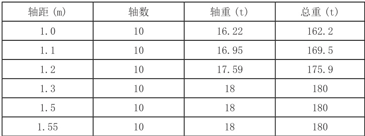 综上,我们可以将一条路线可通行的超重车辆(轴距、轴数和轴重的组合)列于表 2 和表 3 中。当轴重为规定的限制 18t 时,不同轴距和最大可通行轴数见表 2 平板车轴数在 10 轴及以下的占比为 96.5% ,当轴数为 10,不同轴距和最大可通行轴重见表 3AAo 。对于常见的超重运输车,仅通过查表就可判定其通行性,为实现快速审批,可利用本研究方法将超重车运输的主要线路制作成表。