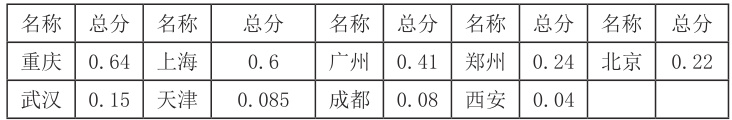 对国家中心城市的紧凑度进行测算,各城市紧凑度排名先后顺序为:重庆、上海、广州、郑州、北京、武汉、天津、成都、西安。整体来看,上海、北京、广州三个经济发达城市排名靠前。重庆总排名第一,主要原因是该城市资源利用充分,它的就业密度和市区开发强度两个指标在九个城市中排名第一。上海GDP 排名略低于北京,单位面积产出、土地密度、道路路网密度排名第一,总分第二。北京由于交通紧凑度在九个城市中排名靠后影响了总排名。人口紧凑度最高的是郑州。西安由于经济紧凑度和土地紧凑度得分不高导致总分较低。