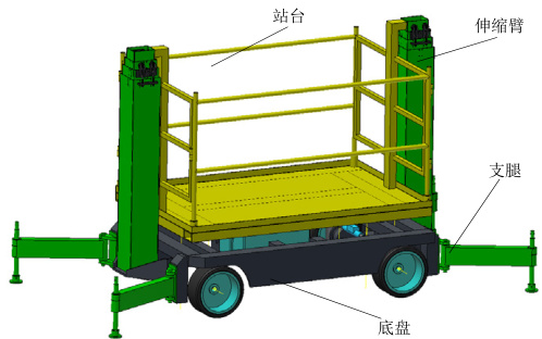登高作业车采用 “底盘 - 支腿 - 伸缩臂 - 站台” 四级架构(图 1)。底盘为纯电驱动后驱结构,支腿呈 X 型布置,双伸缩臂对称安装于底盘中部,站台通过铰接座与伸缩臂顶端连接。整机尺寸 1600mm×850mm×1800mm ,空载自重1.68 吨,最大作业高度 7.2 米。