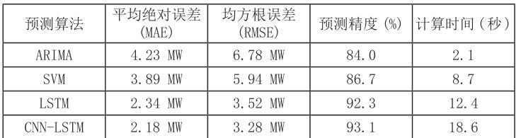 LSTM 神经网络在处理新能源发电功率时序数据方面展现出显著优势,其独特的门控机制使得模型能够有效捕获风电与光伏发电的长期依赖关系,算法采用三层 LSTM 结构 [1],每层包含 128 个神经元,通过遗忘门与输入门及输出门的协同作用,实现对历史功率数据中关键特征的筛选与记忆,训练过程中采用 Adam 优化器,学习率设置为 0.001,批量大小为 32,训练轮次为 200 次,模型输入层接收 72 小时历史功率数据与气象参数及时间特征,输出层预测未来 72 小时的发电功率。通过 dropout 技术防止过拟合,正则化参数设置为 0.2,实验结果显示,LSTM 模型在不同天气条件下的预测精度均保持在 90% 以上,相比传统时间序列方法提升了8.3 个百分点(见表 1)