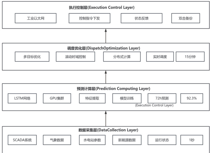 预测调度系统采用分层分布式架构,包含数据采集层与预测计算层及调度优化层与执行控制层四个功能模块,数据采集层通过 SCADA 系统实时获取水电站运行参数与新能源发电数据及气象信息,数据采样频率为 1 秒,预测计算层部署在高性能计算集群上,配置NVIDIA V100 GPU 加速深度学习模型训练与推理过程。调度优化层运用分布式计算技术,将大规模优化问题分解并行求解,计算效率提升了 60% ,执行控制层通过工业以太网连接,响应时间小于100 毫秒,系统配备双机热备份机制,年可用率达到 99.7% (见图 1)。