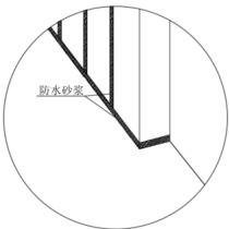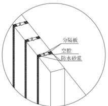 采取联通口预止水构造方式在项目 1 和项目 2 部分联通口进行封堵施工,施工步骤主要为:(1)地下室结构施工;(2)进行联通口封堵,所使用的预制墙按照图 2 中设置内侧及外侧分隔板;(3)需预留施工间歇确保预制墙需充分沉降;(4)如图 3 所示,采用具有防水砂浆封闭预制墙底部空隙两侧,预制墙底中部形成空腔结构;(5)在预制墙两分隔板外侧使用同底部防水材料进行封堵,在底部与基础底板交界处预留约 20mm 高注浆孔;(6)如图4 所示,将沥青基固化防水材料注满预制墙底部空腔及拼缝空腔;(7)联通口外侧沥青基卷材防水施工;(8)回填土施工时应减小对联通口的扰动。