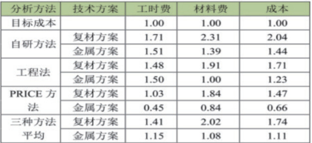 根据上表可以看到三种方法测算结果都显示复材方案成本大于金属方案成本且材料费差异比较大。