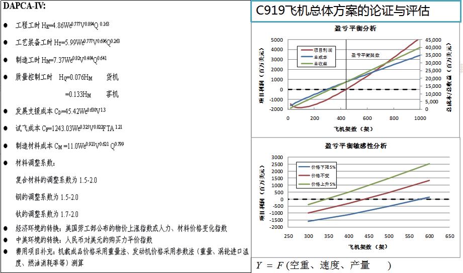 机研制任务与研制经费相匹配。研究结论是上飞院基本完成一级网络图中规定的计划任务,设计研发经费控制在可研节点经费范围内,经费使用与研制任务基本保持匹配。《C919飞机单机成本分析报告》主要运用自行开发的估算软件来估算机体结构件成本和运用工程法和经验来估算系统件价格,最终算出 C919 飞机的单机成本数据。并将 C919 飞机单机成本估算数据分别与机体目标成本及同类竞争机型成本对比。研究结论是 C919 飞机的单机成本基本可以满足公司总部的成本控制要求,并且亦符合一般民用运输飞机的成本构成规律。《C919 飞机详细设计阶段运营经济性计算分析报告》主要通过 C919 飞机销售价格分析、C919 飞机运营经济性分析、C919 飞机与竞争机型分析结果比较、重量变化对经济性的敏感性分析,确保 C919 飞机直接运营成本(DOC),满足《C919 飞机设计目标与要求》,与竞争机型相比具有一定经济性优势。