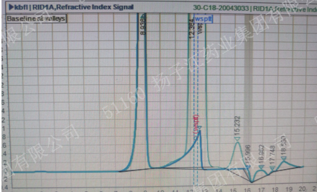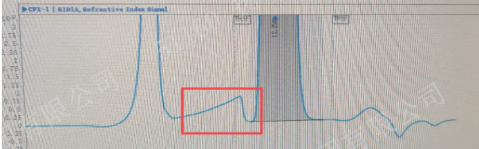 但我司在本品近期的稳定性考察样品的检验过程中发现其无水葡萄糖含量测定结果异常增长,故开展以下研究:对无水葡萄糖含量结果异常的6 批样品从人、机、料、法、环、测各方面开展检测全过程的调查,发现供试品图谱与该分析方法首次转移至本实验室时的供试品图谱不完全一致,供试品图谱主峰前基线明显异常上升,经查询其他历史检测批次发现供试品图谱中葡萄糖主峰前有分离开的醋酸根峰,但本次检测中供试品图谱中葡萄糖主峰前均无醋酸根峰,故怀疑醋酸根峰被包裹进葡萄糖主峰从而导致供试品无水葡萄糖峰面积异常偏高,致使检测结果偏高,为证实该假设,取空白辅料溶液及供试品溶液各进样 1 针,叠加进样图谱可明显看到醋酸根峰出峰位置与供试品溶液中葡萄糖主峰出峰位置重叠,如下:
