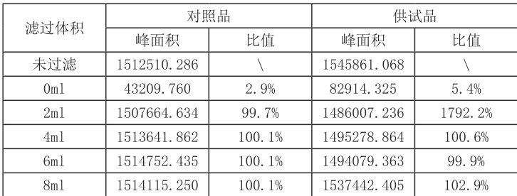滤过体积为 0ml 与未过滤峰面积比值为 2.9% ,滤过体积为 2ml 、4ml、6ml 和 8ml 与未过滤峰面积比值均在 98.0% ~ .102.0% 之间; 过柱前供试品溶液中主成分峰和醋酸峰未分开,滤过体积为 0ml 、2ml 的供试品溶液与前一份峰面积比值分别为 5.4% 、 1792.2% ,滤过体积为 4ml 、6ml 的供试品溶液主峰与前一份峰面积比值分别为 100.6% 、 99.9% ,滤过体积为 8ml 的供试品溶液主峰与前一份峰面积比值分别为 102.9%. 。综上所述,确定弃去体积为 4ml