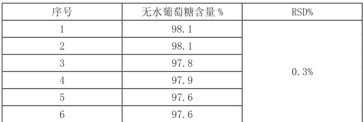6 份供试品溶液中无水葡萄糖( (C6H12O6) )的含量均在 95.0% - .110.0% 之间,RSD 为 0.3% ,重复性结果良好。