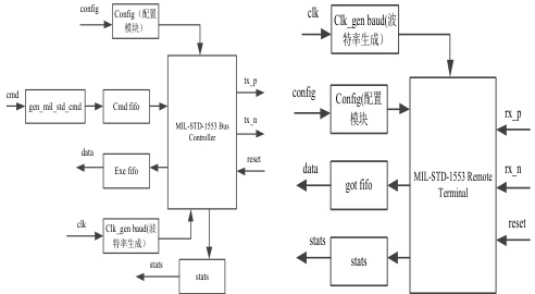 1553B 总线网络由终端或子系统、总线传输介质组成。子系统为从多路数据总线上接收数据传输服务的装置或功能单元。终端是数据总线和子系统的接口电子组件。从功能上说终端可以是总线控制器(Bus Controller,简称 BC)、远程终端(Remote Terminal,简称 RT )或总线监控器(Bus Monitor,简称 BM);从物理结构上说,终端可以是独立组件,也可以包含在子系统中。其中,总线控制器用于向总线发送数据,远程终端用于从总线接收数据,而监视器用于显示整个操作过程。