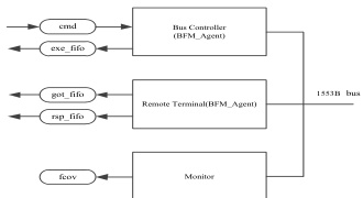 (2)BFM 根据参数生成测试激励,并将产生的测试激励通过 1553B 数据总线将测试激励传输从 BC 传至RT :BFM 根据参数生成指令集,其中指令集根 (members)、方法(Methods)、字段定义(Fields Defines)和子类(Sub Ty 目的地址的赋值,从测试用例集中选取对应的测试用例并将该用例作为测试激励。使用 BC 的 c d fifo 模块向 RT 的 got fifo 模块发送总线空闲信号;在 RT 的got fifo 模块接收到该信号后,将测试激励的数据包通过1553B 总线传进行接收,并在传输结束时,stats 模块更新所有的统计计数器。