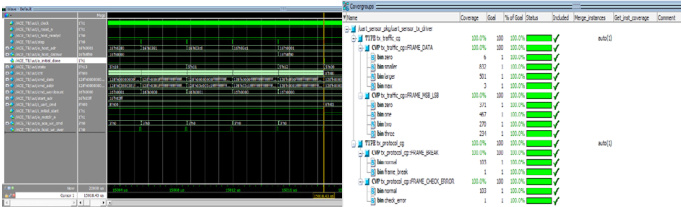 在各项参数设定完毕后,我们模拟由 BC 开始向 RT 发起一个接收指令,RT 在给定的响应时间范围内发回一个状态字并执行消息的发送的总线通信过程。从 tests 中分别选取命令帧和数据帧作为测试用例进行发送,其中命令帧包含了由参数提前设定好的消息类型、消息长度、RT 地址、消息子地址以及消息间隔等信息,数据帧包括了接收命令字,数据字和状态字。图 5 可以看到,初始化完成信号拉高后,在数据帧的发送过程中,cmd_fifo 和 got_fifo 能按照源地址和目的地址正确完成数据的传送,帧字节数自动累加,在接收到最后一个状态字后,状态机能正常跳变,RT 在给定的响应时间范围内发回一个状态字并执行消息的接收 / 发送过程。BC 通过验收 RT 回答的状态字来检验传输是否成功并做后续的操作,直到完成全部数据帧的接收 / 发送。针对 UVM的功能覆盖率,本验证平台提供了较为直接准确的方式。如图 6 所示,验证平台对实例化的 BFM 和 Monitor 输入和输出信号区间进行了采集,其功能覆盖率达到了100%。