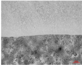 在微观视野下对凸轮轴激光熔覆试样进行分析,熔覆层区域存在个别气孔,最大直径 12.782um。这表明在激光熔覆过程中,气体的逸出情况得到了较好控制。按照 GB/T 42401-2023《激光熔覆修复缺陷质量分级》中有关孔隙缺陷分级的判定标准中严格一级的要求( d⩽( .2H,单层气孔的投影面积占比:⩽1% ),满足标准中严格级的要求。热影响区金相照片(图1),晶粒度8 级。熔覆区域晶粒度难以辨识,该现象反应出凸轮轴激光熔覆试样具有独特的微观结构。这种特殊的微观结构赋予激光熔覆试样卓越的力学性能、耐腐蚀性以及其它功能性表现。