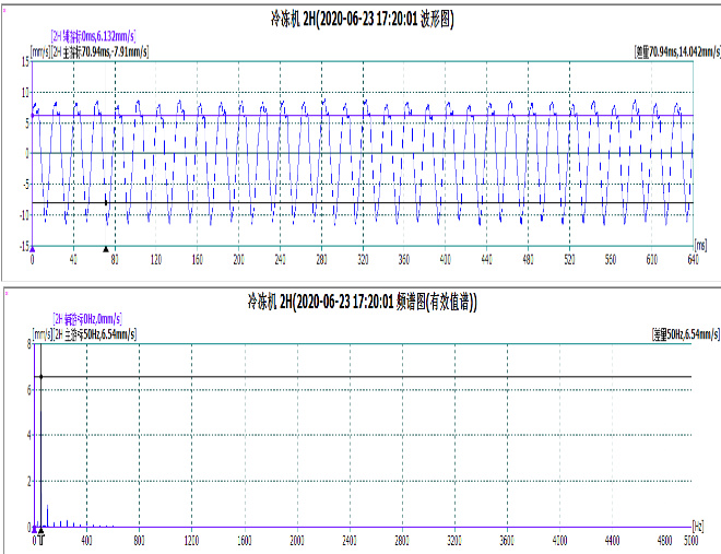 新安装冷冻机于 2020 年 6 月 7 日调试完毕后试运行,当冷冻机负荷为 29% 时,冷冻机振动烈度最大值为 7.0mm/s ,根据 GB/T 7777-2003《容积式压缩机的振动测量与评价方法》允许最大值为 11. 2mm/s ,接近振动允许的最大值。电动机振动烈度最大达到 7. 2mm/s ,根据GB/T 6075 的标准,允许最大值为 4. 5mm/s ,振动区域由 C 升至 D 区,不能满足设备长周期运行要求。在冷冻机负荷提高到 45%、65% 后,冷冻机与电机振动没有下降,冷冻机从动轴垂直方向振动烈度最高达到 11. 2mm/s ,电机振动烈度最大达到 8. 2mm/s 。2020 年 6 月 23 日对电机进行单试,电机各测点数据均超标,驱动端水平振动烈度达到 9.2mm/s. 。目前电机与冷冻机振动均超过国家标准。