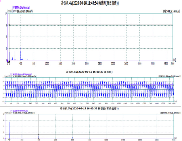 经过电机动平衡试验后,电机振动由最大振幅9. 06mm/s 降低为1. 63mm/s ,振幅下降明显,电机振动由D 区提升到A 区。冷冻机振动由 10.41mm/s 降低为 1.61mm/s ,振幅下降同样明显,冷冻机运行达到国家标准GB/T 7777-2003 的运行要求。