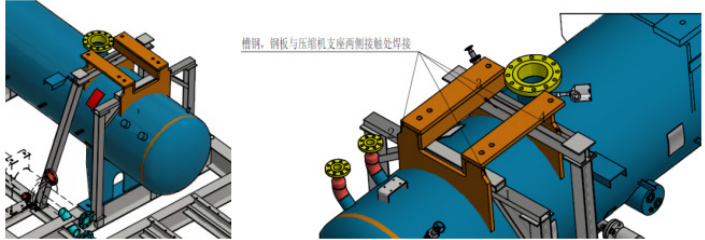 对冷冻基础进行加固,在撬装基础上选定柱脚,利用柱脚在基础两次安装门型支架两处,采用焊接方式分别加装在冷冻机基础两侧,增强冷冻机基础刚性,解决基础刚性不足的问题(如图四)。避免冷冻机振动与分液罐的相互影响,达到消除振动的目标。