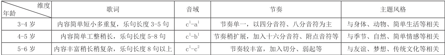 1. 歌曲选择:选择旋律优美、节奏鲜明、歌词简单,富有律动感的歌曲;有拟声词、问答句、重复句等容易设计动作的趣味性歌曲;传递友情、亲情等积极情感,表达勇敢、自信等良好品质或习惯,认知与文化元素等教育意义的歌曲。不同年龄阶段的幼儿歌曲选择如表1 所示。