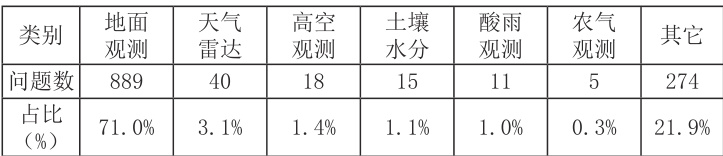 地面观测涉及面广,站点数量多,既包含国家级自动观测站、又有地面天气站(区域站),是气象部门观测业务活动最多的类别。如表 1 所示,内审活动中地面观测业务问题数 889 条,占比最重,达 71.0%,有样本分析意义。