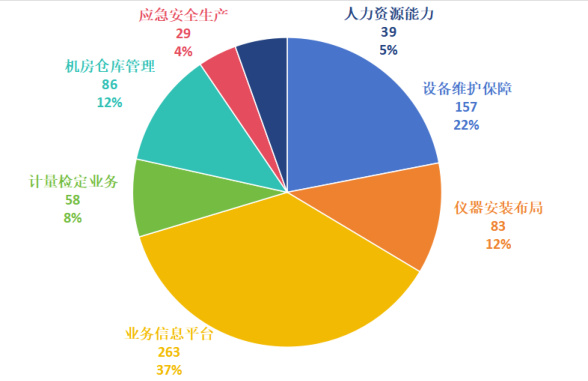 仓库是指存储气象仪器备件的库房,机房是指指网络机房、发电机机房等,内审共发现 86 条问题中,记录与台账不完善,占比最高,达29%,“制度与标识缺失”占比23%,“设施与环境”占比24.7%。