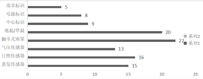 观测场地仪器安装布局关系到观测数据的准确性、代表性、可比性。对仪器安装布局方面 82 条问题统计发现,地温场尺寸、草温间距不 规范等问题数最多,共 22 条,占比 26.8% ;日照传感器不水平、气压 /雨量筒安装高度偏差等,占比分别 20 % 和 15.8% ;2024 年通过国债项目蒸发传感器安装位置错误,占比达14%。南北标志缺失、电源开关无标识、中心标识模糊等也占有一定的比重。分布情况如图2 所示。
