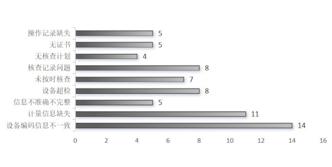 检定校准核查是确保气象仪器测量结果准确、可靠、可溯源的一系列技术和管理活动,是气象数据质量最根本的保障。分析计量核查业务出现的 58 条问题发现,气象计量信息平台计量信息与设备编码不一致共问题14 条,占比24.6% ;雨量传感器、能见度仪等设备未到期核查等问题7 条,占比12.3% ;仪器超检问题达8 条,占比13.7%。具体分布如图3 所示。
