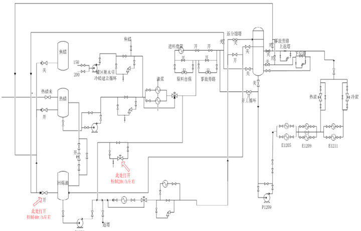 2.4.1 优化分馏塔操作,尽快建立稳定分馏一中段循环回流,保证稳定塔底有足够的热量。2.4.2 分馏中段热源不足时,粗气油严禁并入吸收稳定系统。2.4.3 稳汽蒸气压不合格的情况下,稳汽严禁外送,避免外送污油携带 C3 、C4 进入污油罐造成事故。2.4.4 再吸收塔不要过早投用,待贫吸收油塔外循环正常后,少量引油进入再吸收塔,待再吸收塔液位正常后,方可正常投用,防止气体串入分馏塔。2.4.5 建议增加解吸塔底、稳定塔底增加旁路蒸汽热源,开工时用蒸汽代替分馏塔一中段、二中段热源,保证吸收稳定系统提前开工。