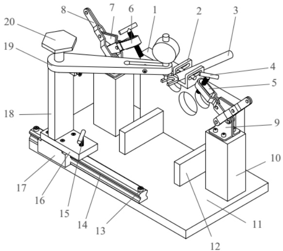 2.2 该装置具体由以下零部件组成:1- 定位板,2- 滑槽,3- 调整拨叉,4-第一T 型螺栓,5- 第一T 型螺栓座,6-U 型连接板,7- 锁紧板,8- 锁紧把手,9-L型连接板,10- 立柱,11- 基座,12- 支撑板,13- 限位套,14- 直线导轨,15-第二T 型螺栓,16- 连接板,17- 滑块,18- 支撑腿,19- 表夹,20- 压紧螺栓。