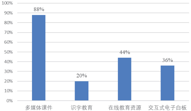 图2 教师使用信息技术工具的情况大部分教师使用多媒体课件进行识字教学,占比为 88% ;识字软件、多媒体课件、在线资源占比都比较少,其中识字教育占比最少,仅为20%。由此可知,多媒体课件在识字教学中占有重要位置,其他的信息技术工具也不同程度地助力了识字教学的顺利进行。