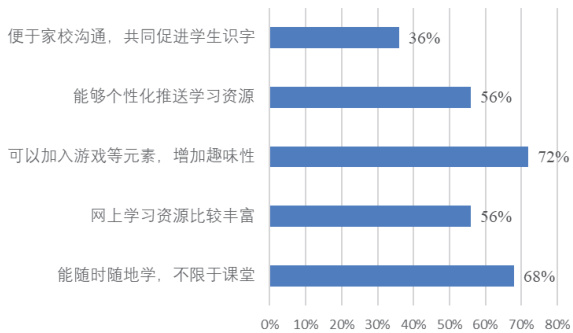 (5) 便于家校沟通,共同促进学生识字。信息技术搭建了家校沟通的桥梁,有利于家庭和学校共同努力,促进学生识字二、学生对信息技术使用优势的评价