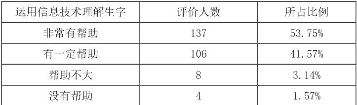 由上表可知,学生认为信息技术能够帮助他们快速认识生字的,占比为56.86%。信息技术能够运用多样化的方式帮助学生识字,例如图片与动画结合、3D 模型展示、识字软件游戏等。