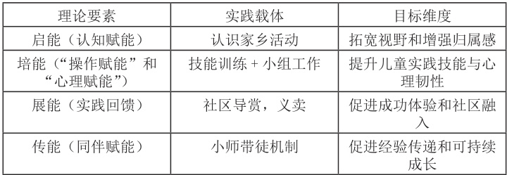 农村困境儿童及留守儿童自我效能感偏低,影响其社会适应与长远发展。本实践以W 镇“童梦同行”项目为案例,依托班杜拉自我效能理论及赋能视角,构建“启能 - 培能 - 展能 - 传能”四能工程实践框架,通过多方联动机制整合在地资源,开展系统化、层次化服务。项目以“乡村儿童走出去”思路,引导乡村儿童先从“走家乡”出发,通过认识和了解家乡特色和资源,增强与家乡的联结和归属,增长见识。社会工作者运用自我效能理论和赋能理论,推动儿童通过成功经验和良好情感体验,提升其人际技巧、情绪管理、目标制定及解决问题能力,从而提升儿童能力和自我效能。