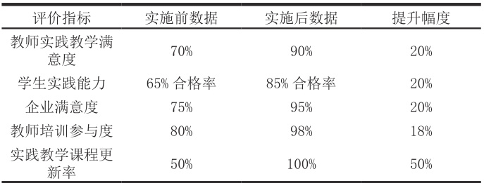 通过上述数据可以看出,在实施了一系列提升教师实践教学能力的措施后,该职业技术学院的教师实践教学满意度、学生实践能力、企业满意度以及教师培训参与度均得到了显著提升。同时,实践教学课程的更新率也达到了100%,说明学院在优化实践教学体系方面取得了显著成效。