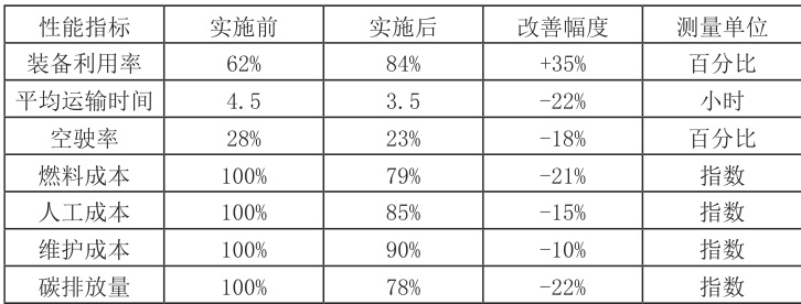 项目实施后,企业运输效率显著提升。“装备利用率”提高了 35% ,空驶率降低了 18%,平均运输时间减少了 22%。同时,运营成本也大幅下降,燃料成本降低 21%,人工成本降低 15% ,维护成本降低 10% 。这些改进不仅提升了企业的经济效益,也增强了其市场竞争力。