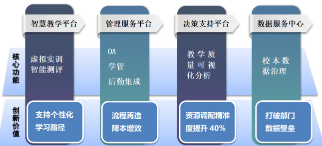 3. 应用层:开发覆盖教学全流程的应用场景,如智能排课、课堂行为分析、实习实训跟踪等。